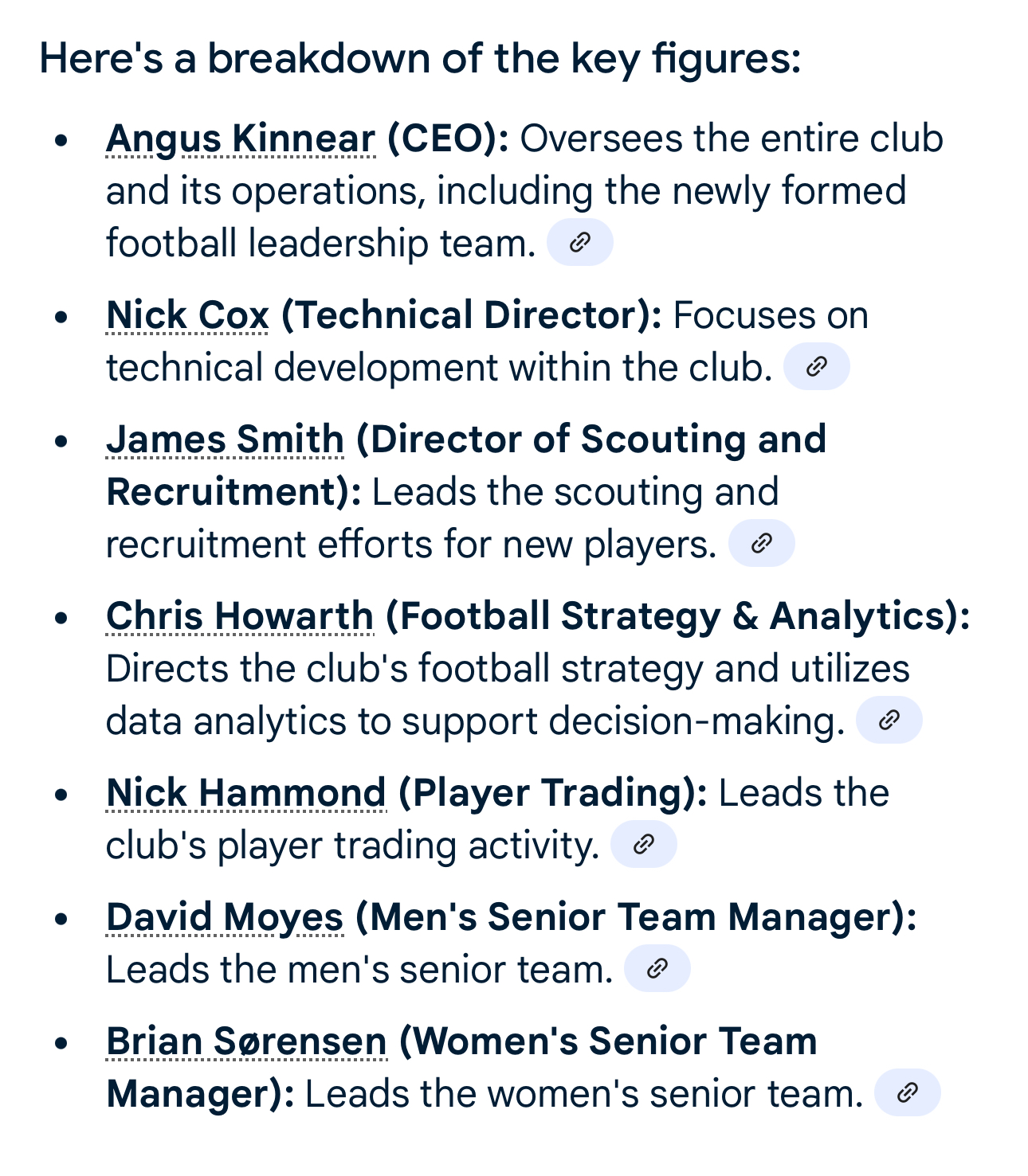 Maybe not directly, but if anything conflates roles it’s the clubs new ‘football leadership’ structure, and Kinear sits squarely at the top of the football operations pyramid, not just general club operations.For some reason we seem to conflating the role of a CEO of a football club with that of a DoF or Sporting Director / Head of Recruitment . Kinnear occupies none of those roles.