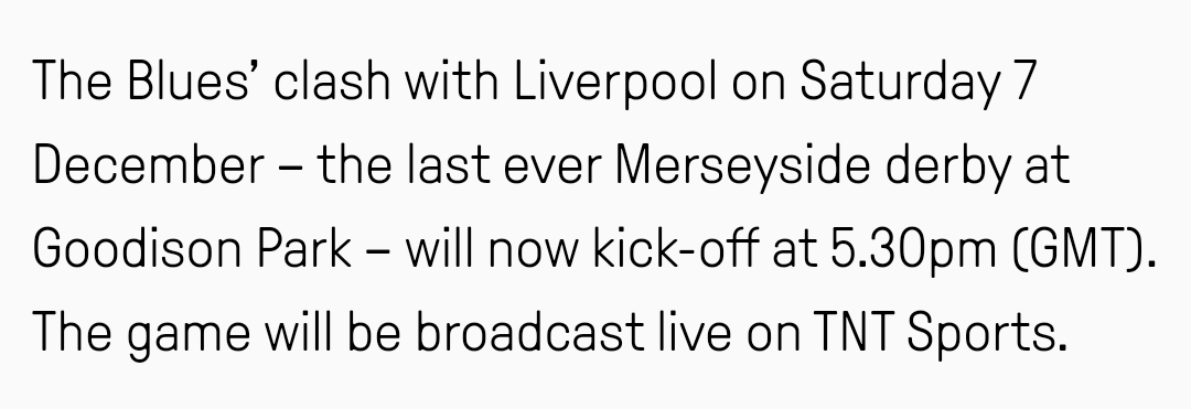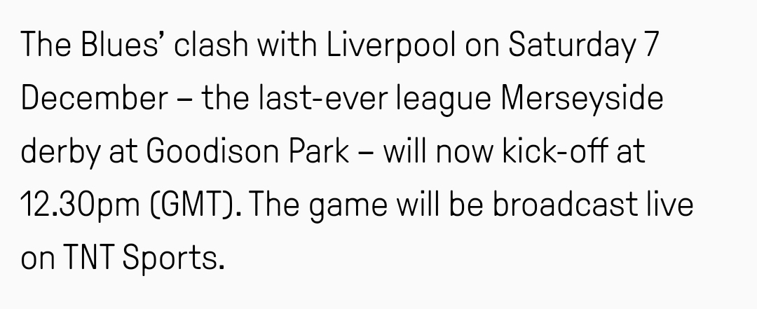 Its good that they a announcing the tv fixtures early enough to let people have a chance at booking travel nice and early. Still easy to make a wrong booking because there are so many KO times that can narrow your travel options.The club put the wrong time for the derby on the website intially. They had it as 5:30pm and i was at the checkout screen to pay for my flights and stopped to double check. Just aswell i did.