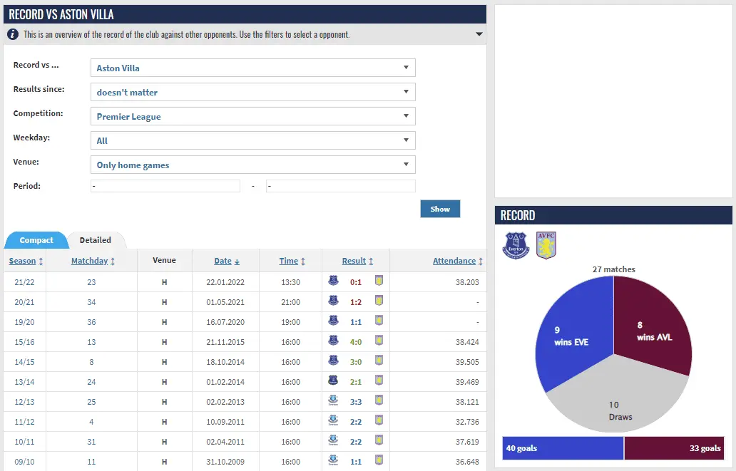 Since the start of the PL, Villa won 23, Everton 13