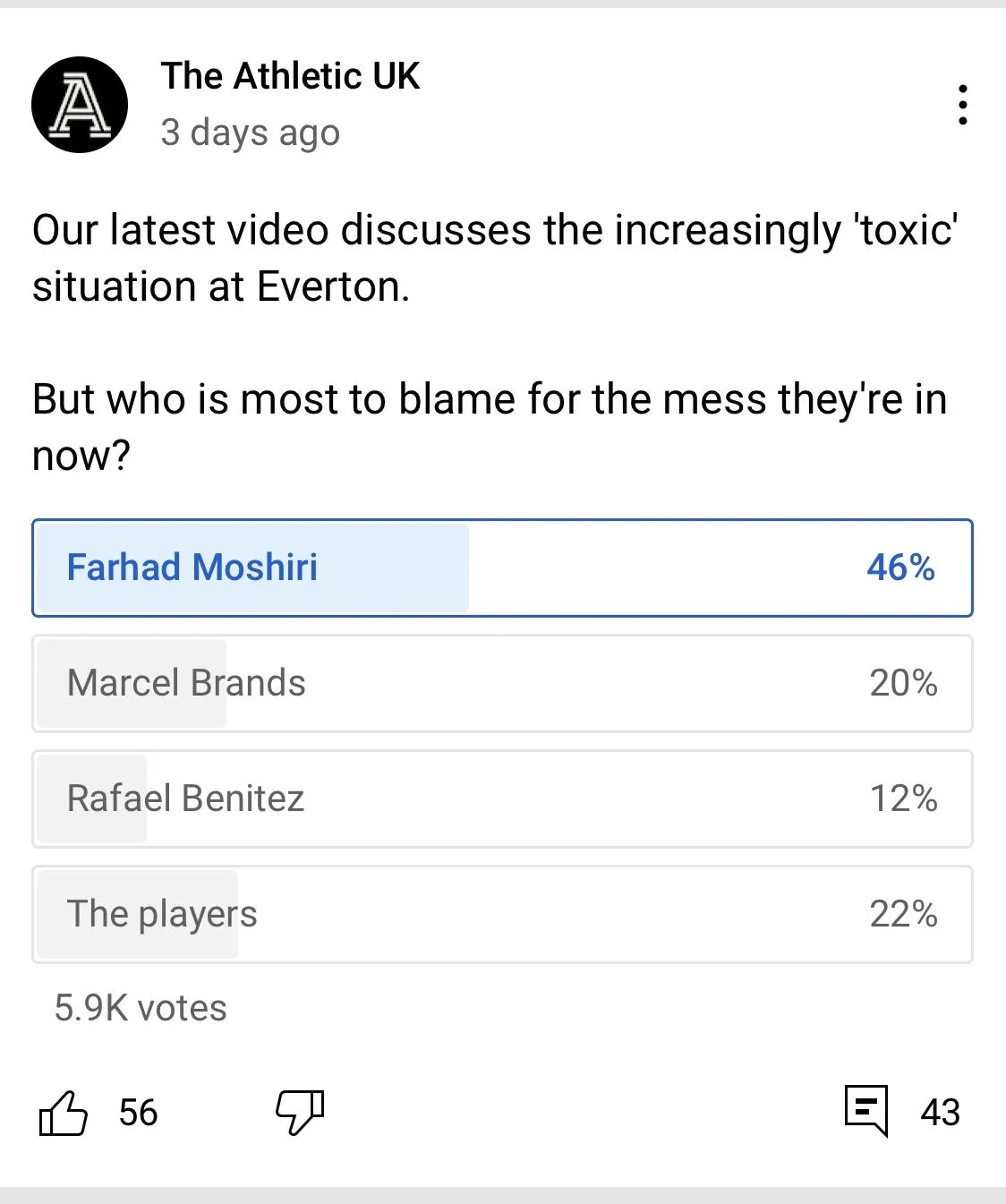 Exactly. And that's who the protest should have focussed on. Moshiri is in trouble here at everton. He's the one everyone knows is to blame. Why the 27 minute people didn't hammer that home and blunted its attack is beyond me. It was way too respectful to Moshiri...almost leaving him one side and pointing the finger elsewhere and encouraging him to act to save his own investment.