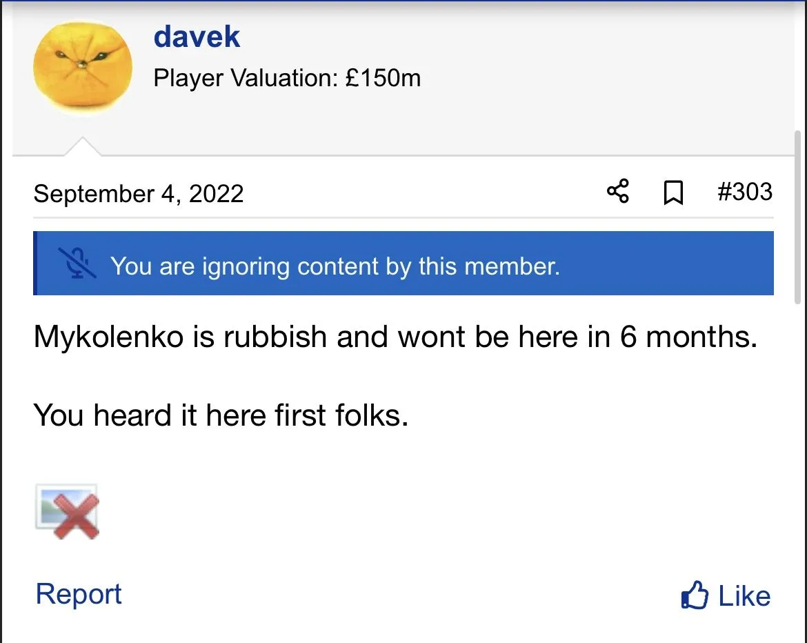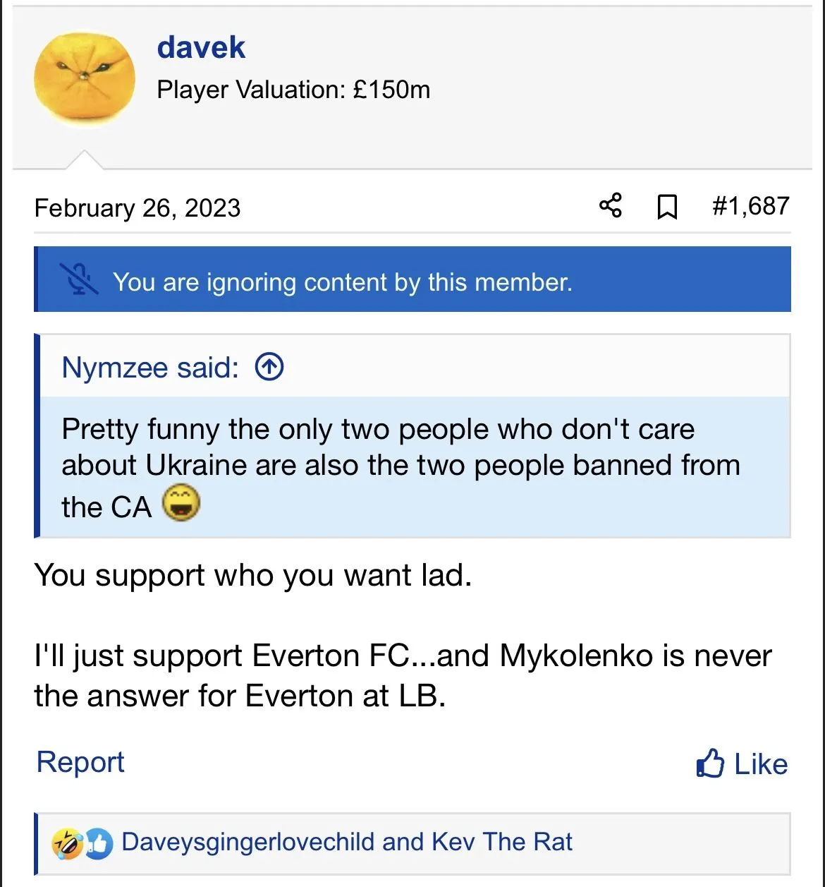 Oh dear. When Kev is liking your posts you know your credibility is waningSome fantastic takes from Dave in last seasons Myko thread. Maybe should have learnt that giving players time can see them settle and become better players. There are more but these are two highlights.