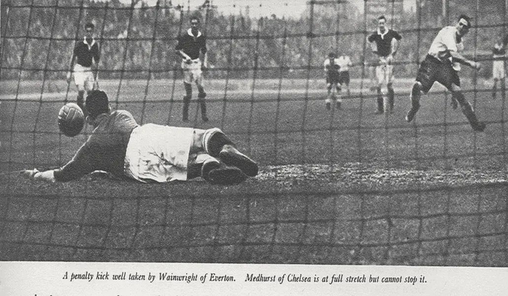 The only game I can find where Wainwright scored a goal from pen v chelsea was on 22.01.49 but it was at Goodison why were blues in white.