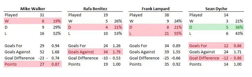 All Dyche needed to save us was a PPG of 1.11, that would give us 35 points (20 points from 18 games) he is currently sat on 1.00 (14 points from 14 games), to hit that figure now he needs 6 points from the last 4, no chance that is happening and there is a very real possibility he will finish on less than 1.00 which is in the realms of Lampard and Walker, he is currently on a par with Benitez.