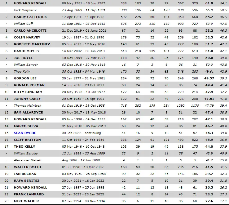 He really needs to be more open to making early subs and changing things when it is obvious that his plans are not working. His brief is to keep us in the prem for the next 2 years and I think he will achieve that, as people have pointed out, without the points deduction, we'd be firmly mid table. I'm not a big fan of Dyche and, despite what some posters have said, I don't believe it gets much better with him than what we have seen so far. I did not think he is a long term solution, but, I don't see who we could bring in as things currently stand at the club, that would do any better.