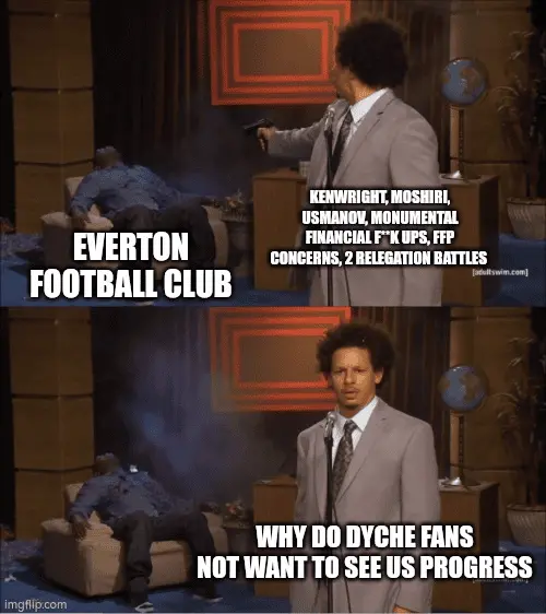 I mean when we played Doncaster who were the worst team in all divisions we only got into their penalty area after 41 minutes into the game under Dyches tactics, so with this in mind the Luton game/result should have been expected, I have said many times before, he sets up to keep things tight and try and nick a goal, that Luton team are an embarrassment to the premier league, any manager worth his salt should pick a team even at Evertons standards and yes our tails were up after 2 wins to beat that pub team, but no, Dyche didn't come out of his tried and only way he knows how to play.