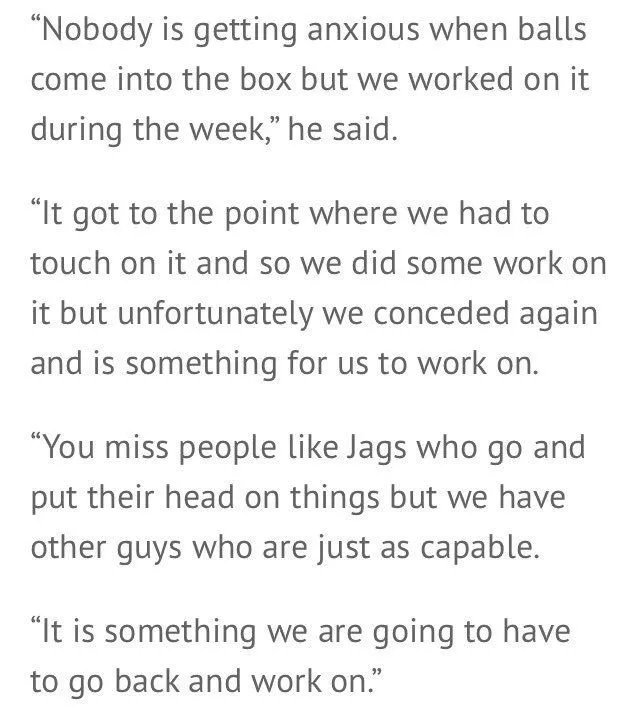 See this just does my head in. While the rate of scoring from corners for the entire league might be 3%, what is it when you take a look at Everton's performances on their own. Based on the last 3 matches I would tell you we are conceding corners more than 3% of the time. If someone did all the tabulation I would bet that we have conceded from more than 3% of corners since Martinez took over. If we are conceding more than the average team in the Premier League from corners then that should be something the coaching staff take note of and address. Baines and Howard are coming out with quotes this week stating that we are working on them now, but this weakness at defending corners has been apparent since the end of Martinez's first season and only now when we throw points away 3 times in a row because of set pieces are we attempting to rectify the situation.