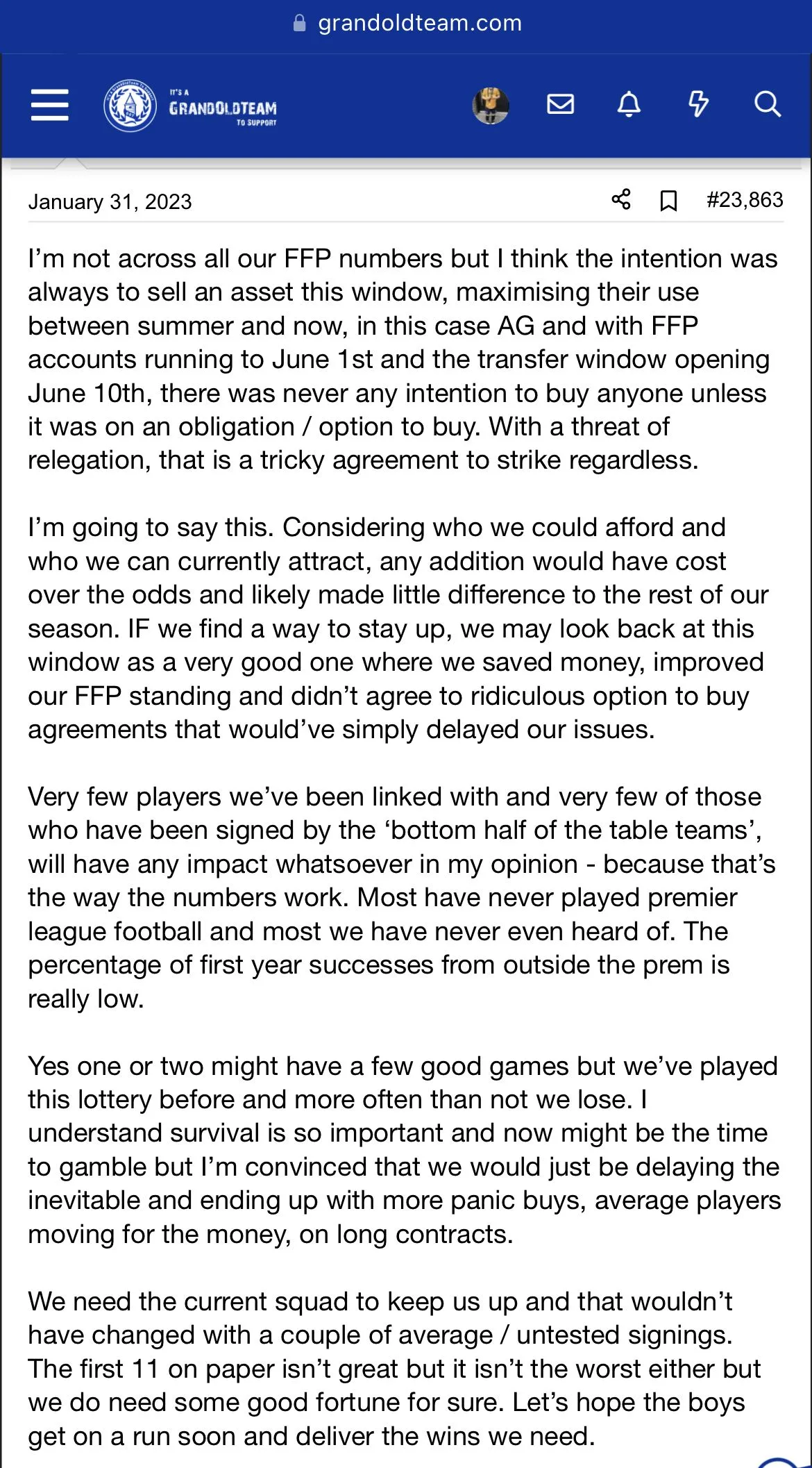 This is a crazy market and we have neither the money, freedom to operate at anything other than a bargain / loan level or the desirability. When players such as Cole Palmer is being sold in excess of £42m, Caicido for £115m, Balogun £40m, Havertz for £65m and many more besides, you realise how nuts this industry has become.