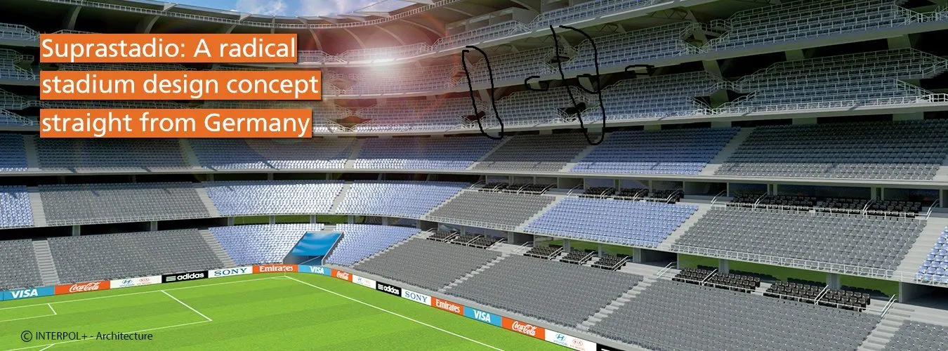 This whole thing strikes me as an Architectural student project. After looking at this a little closer with a learned colleague, there's loads wrong with it and it just wouldn't work, or pass planning/safety certificates. For a small example, the highest recommended rake on a tier is 37.5°. The ones at the top there seem to be more like 60°. Also, recommendations state that there should be equal square meterage for the concourse as there is for the seating is serves so as to maintain the density at full capacity, not allowing for concourse refreshment stalls etc. It looks to me on that image that no concourse at all has been allowed for the upper tiers, so you'd have to go downstairs to what will be a HUGE ground floor concourse. Outside of all this, you have to also consider the view. That upper tier will be akin to looking out of a 12 story window of an office block. The people with a window seat would be able to see the pitch, maybe not the 1st meter of it, but certainly most of it, however the person behind them would see all but about the first 5m, then the person behind that all but the first 12, you can see where I'm going with this.