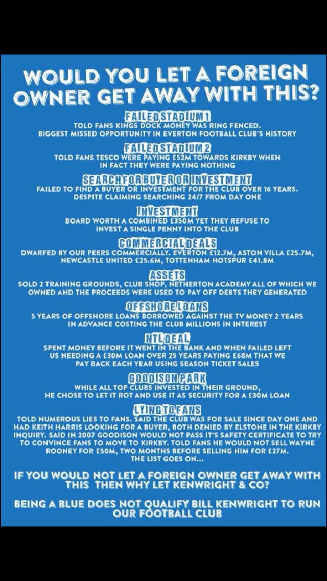 Also, KD was defo down to Kenwright. It was a personal decision to retain control of the club rather than involve the people Gregg had lined up to deliver the finances and stadium. That was his call. If he'd assented we would have had a KD stadium right now and very probably new owners with deeper pockets than Kenwright et al. It was as great an act of vandalism against Everton's future as there's been.